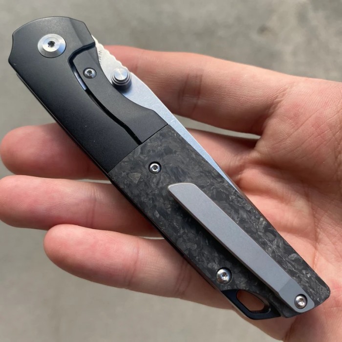 Ez az elegáns, szénbetétes, fekete titán markolatú, kőmosott és szatén felületű CPM-S35 VN
