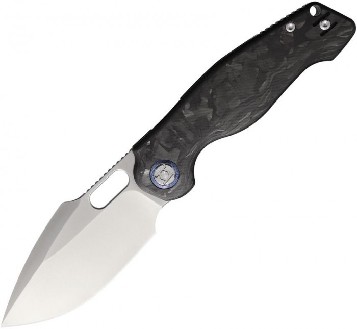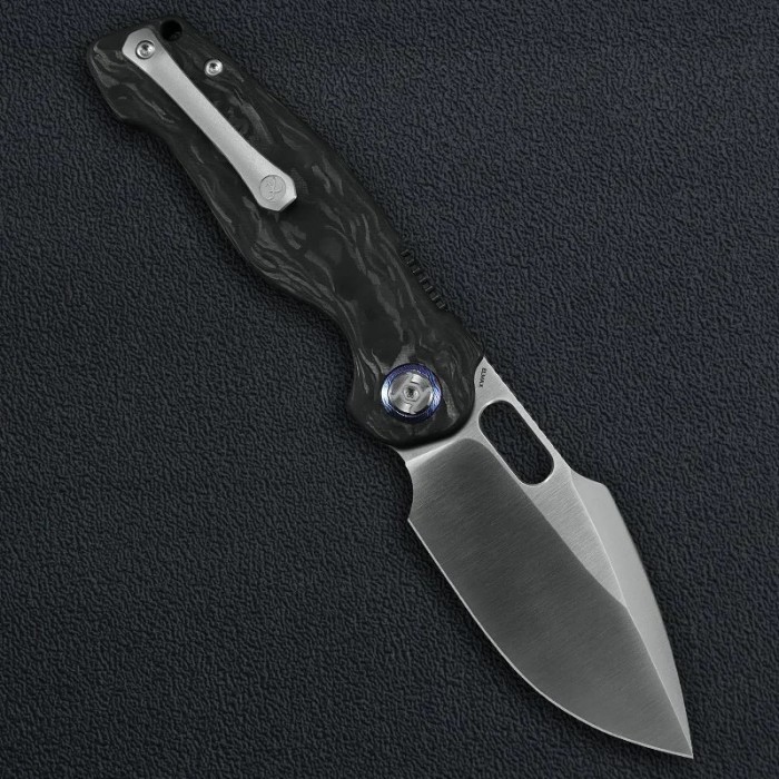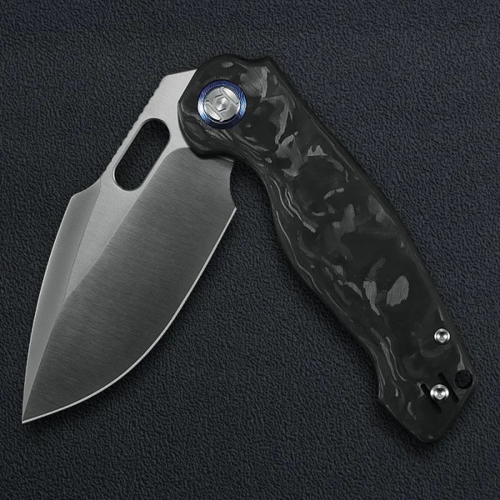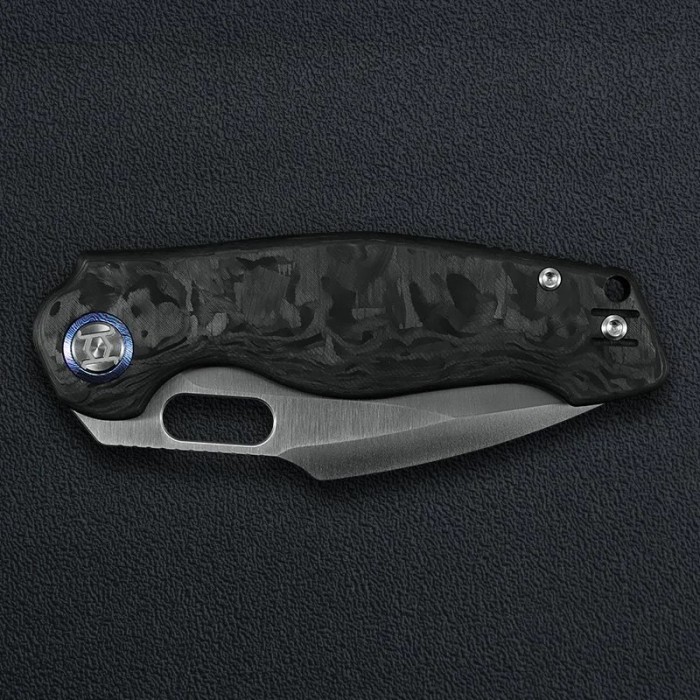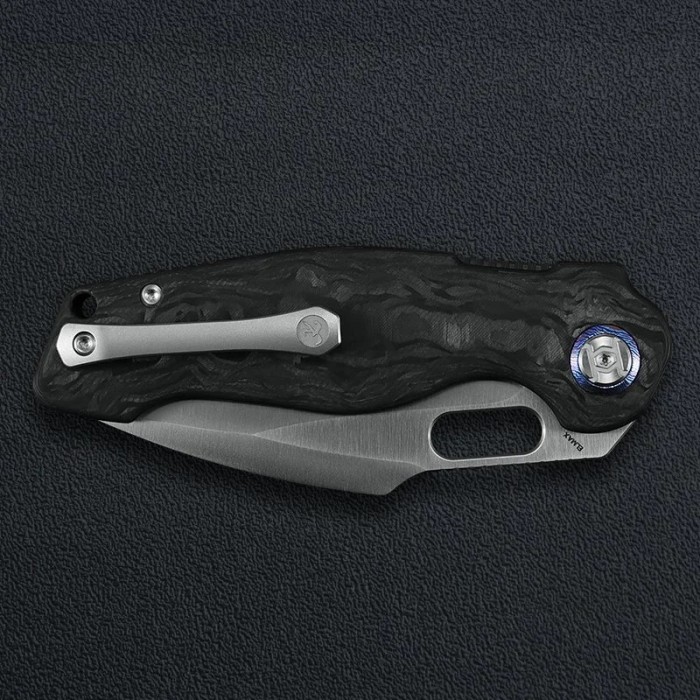 A selyemfényű penge és a sötét carbon mintázat elegáns, technikai megjelenést kölcsönöz