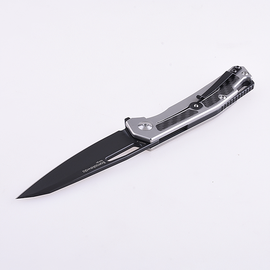 Ez a vagány, szénszálas markolatú, fekete titán bevonatú D2 anyagú pengéjű bicska,
