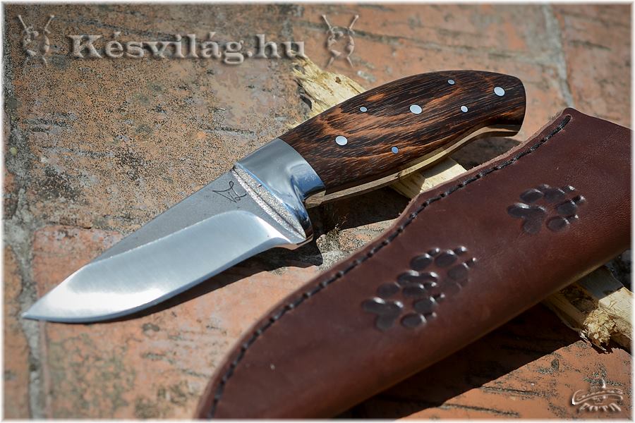 Gyönyörű kidolgozású vadászkés, diógyökér markolattal. Bőrtokkal.
