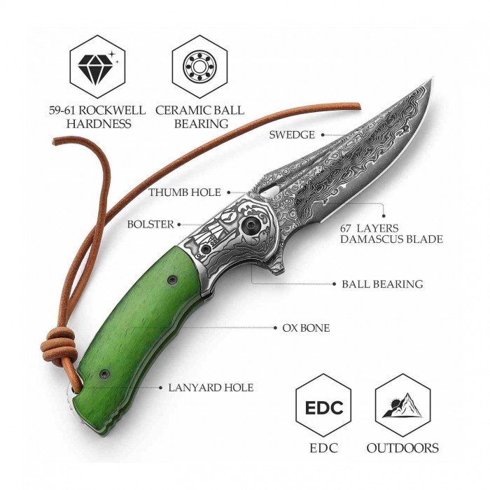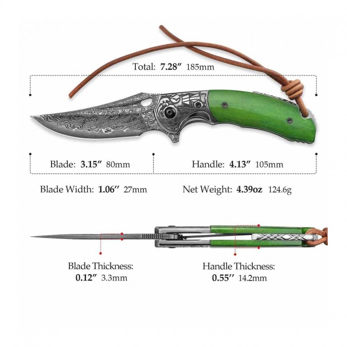 A damaszkuszi acél hipnotikus mintázata és a zöldes árnyalatú, texturált markolat különleges,